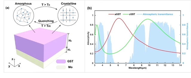 在这项工作中,研究人员提出了一种基于相变材料Ge2Sb2Te5(GST)和耐高温金属Mo的可切换红外隐身双层薄膜,如图1a所示。通过调整GST处于不同的状态,可以灵活控制目标的红外辐射特性,如图1b所示。当GST处于非晶态时,薄膜在3−5 μm和8−14 μm大气窗口波段的低发射率使其具有有效的红外隐身功能。同时,薄膜在5−8 μm非大气窗口波段具有较高的吸收率,显著增强了薄膜的辐射散热能力;而当GST转变为晶体状态时,8−14 μm波段内的发射率显著增加,使得薄膜被调谐到非隐身状态。因此,通过切换GST的状态,可以实现目标在红外隐身和非隐身状态之间的切换,从而实现智能化动态隐身的目的。