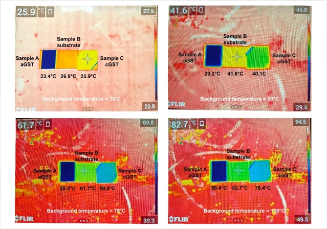 然后研究人员对相变前后薄膜样品的红外辐射特性进行了研究,对比了不同背景温度下,不同相变状态下样品的测量温度,如图3所示。可以直观地发现,与晶体状态的样品相比,当GST处于非晶态时,样品的温度明显低于背景温度。此外,随着背景温度的升高,两种状态下样品之间的温差不断增大。当背景温度达到100℃时,两种样品的温差高达28℃,这非常直观地展示了相变后样品红外辐射特性的巨大变化。进一步证明了所提出的可切换红外隐身膜的可调性能和实际应用的可能性。