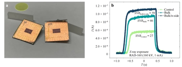 图3: a. 钙钛矿光电探测器照片;b. X射线通量(钨管源)诱导下,探测器对闪烁CsI光进行转换的信噪比(SNR)测量结果。信号曲线对应于X射线源的开启状态