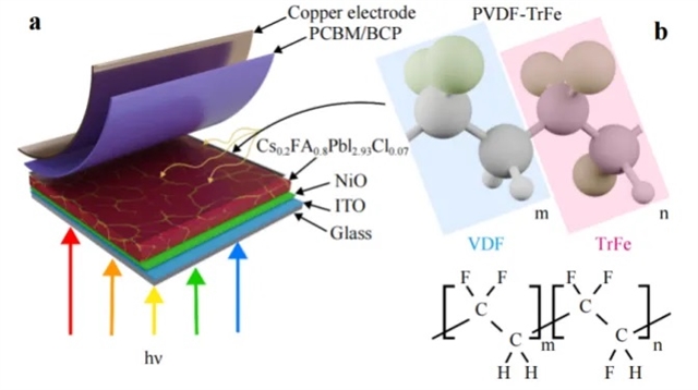 图1:a. 带有P(VDF-TrFE)介电层的光电探测器示意图;b. P(VDF-TrFE)的分子结构示意图