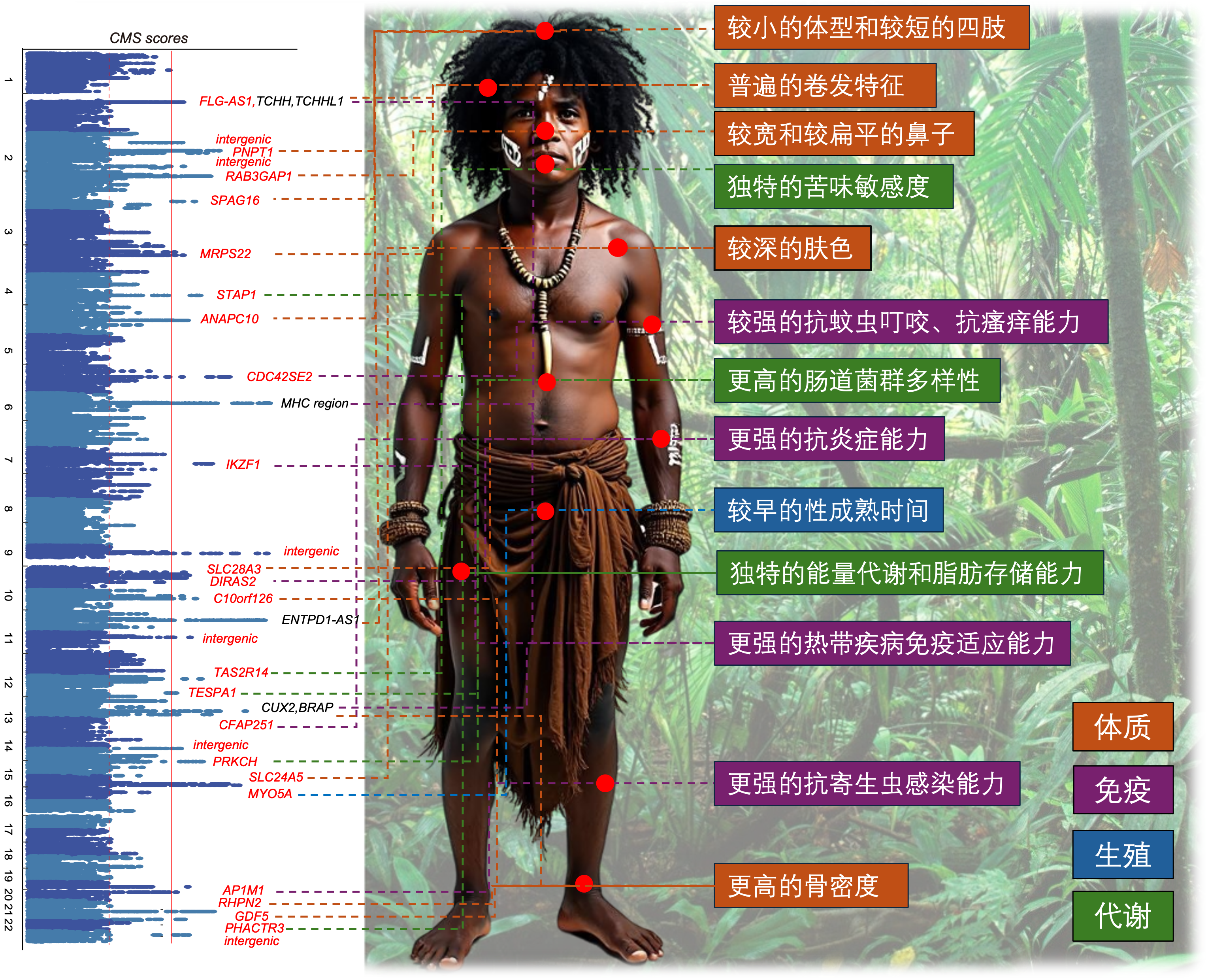 例如,SLC24A5基因通过调控皮肤色素沉着抵御热带地区的强紫外环境;CDC42SE2基因可以减轻热带雨林地区蚊虫叮咬反应;MRPS22基因促成的卷发表型可加速散热等。
