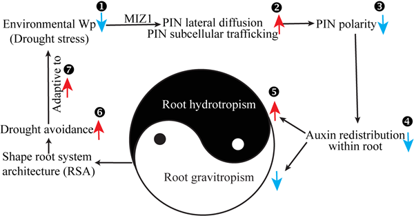 根系作为植物吸收水分和营养物质的重要器官,可以感知土壤中水分的变化,并通过向水分充足的地方生长,来提高植物对土壤水分的利用效率,这种现象称为向水性生长。 MIZ1 是调控植物根系向水性生长的关键基因,但是其调控机理并不是非常清楚。植物根系向重力性生长和向水性生长与植物对逆境的适应密切相关,已有研究表明根向重力性和向水性生长存在拮抗关系,但是MIZ1是否能够权衡这两种向性生长来帮植物适应干旱环境并不清楚。