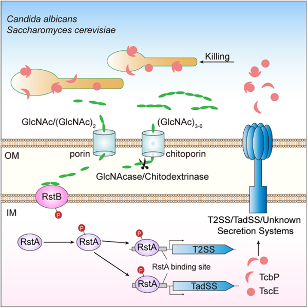 研究发现,细菌在面对真菌竞争者威胁时,通过双组分系统(TCS)的组氨酸激酶RstB将几丁质信号作为PAMP进行识别,进一步激活经典的II型分泌系统(T2SS)及其亚型紧密粘附分泌系统(TadSS),促进几丁质酶TscE和几丁质结合蛋白TcbP的分泌,其中几丁质结合蛋白TcbP可以显著增强TscE的几丁质酶活,帮助TscE降解几丁质生成GlcNAc,(GlcNAc)2和(GlcNAc)3。通过体内和体外细菌-真菌共培养实验证实T2SS/TadSS/TscE/TcbP通路可以有效拮抗真菌,从而增强细菌的生态占位功能。进一步研究RstB受体介导的几丁质类信号识别和信号转导机制发现,RstB通过其周质配体结构域特异性结合几丁质降解产物(GlcNAc)2,进而增强下游调控蛋白RstA的磷酸化水平,激活T2SS/TadSS/TscE/TcbP系统的表达以杀灭真菌。