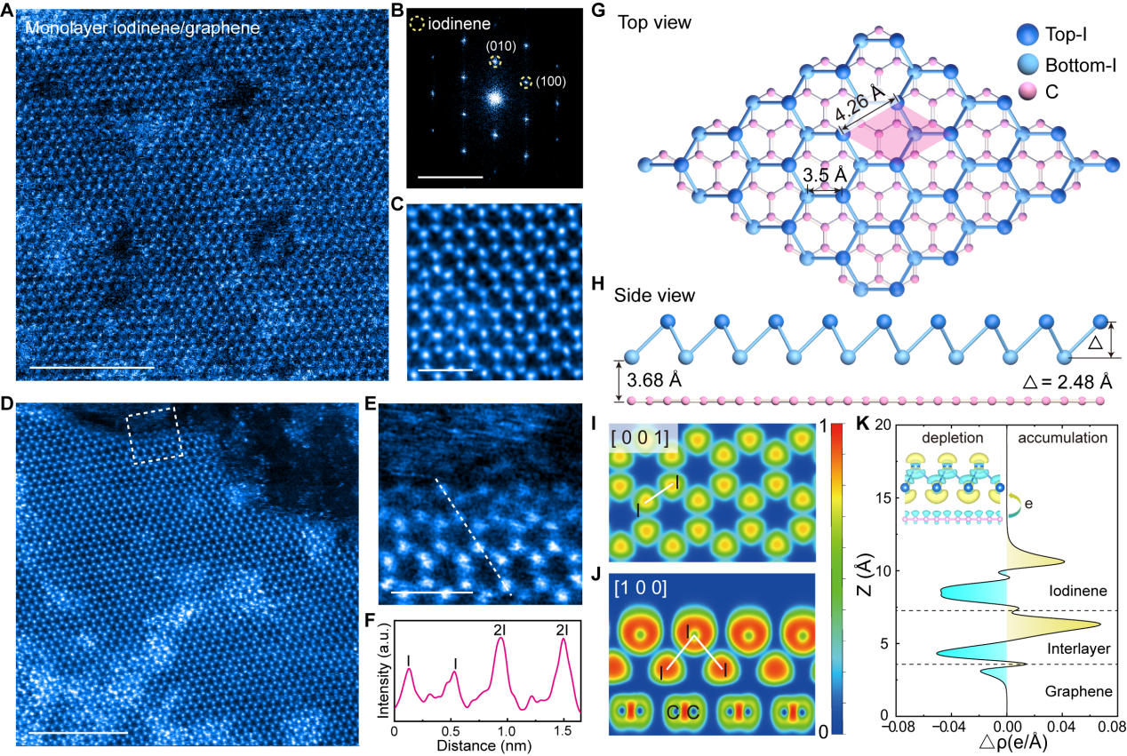 图2:石墨烯衬底上碘烯的原子级结构。