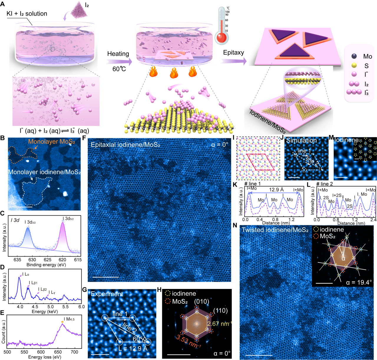 图1:在MoS2上模板法外延生长单层碘烯。