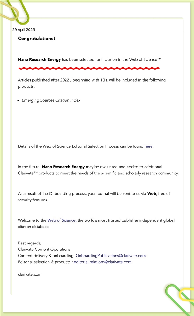 近日,Nano Research Energy 正式被科睿唯安旗下 Web of Science 核心合集ESCI(Emerging Sources Citation Index)数据库收录。ESCI数据库将回溯并检索 Nano Research Energy自2022年以来的所有已发表论文。