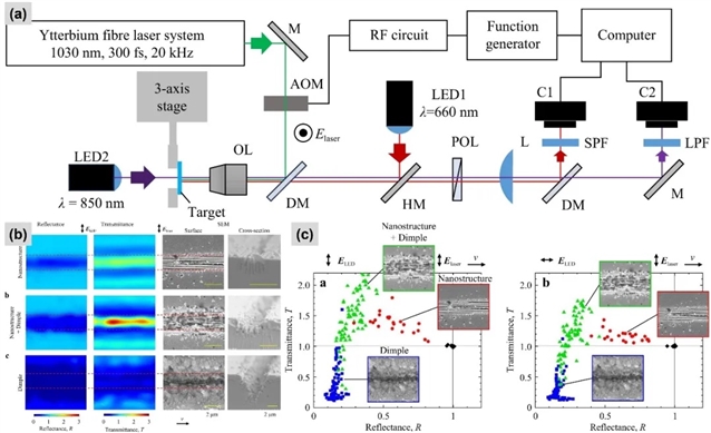 研究团队采用创新的光学监测系统实时跟踪纳米结构形成过程。他们使用波长1030 nm、脉宽300 fs、重复频率20 kHz的掺镱光纤激光系统产生飞秒激光脉冲,处理合成二氧化硅玻璃板表面,同时通过声光调制器精确控制激光功率。系统巧妙地利用两种不同波长的LED光源(660 nm和850 nm)照射加工区域,实时收集反射光和透射光信号作为反馈。