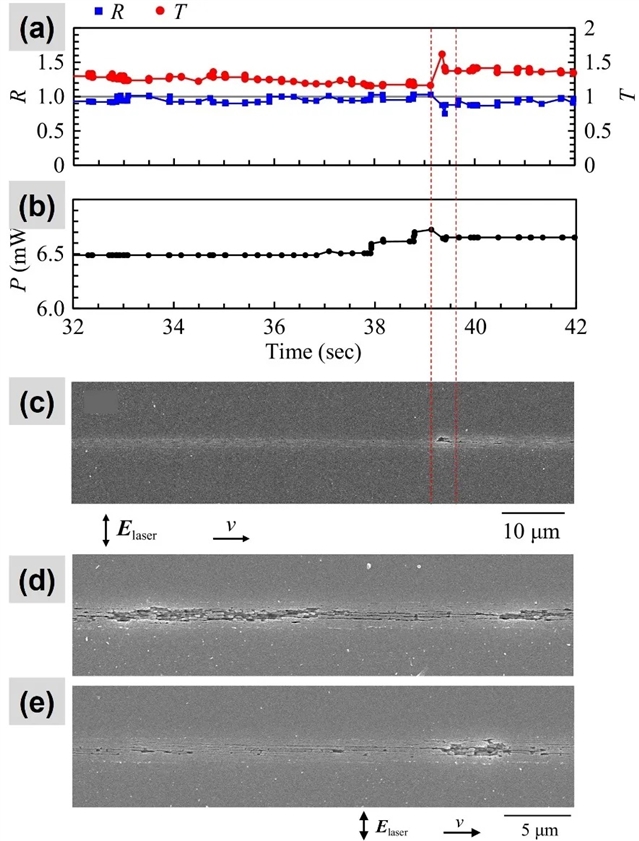 研究人员发现,高质量纳米结构的形成与特定的光学响应密切相关。对比扫描电子显微镜图像与光学监测数据,他们确认均匀、高线性度的纳米结构会导致反射率降低而透射率提高。通过系统调整激光功率和扫描速度,研究团队确立了表征优质纳米结构(周期约200 nm,深度约1 μm)的光学指标——反射率0.6±0.1,透射率1.4±0.1。