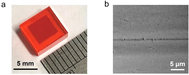 图3:量子点嵌入钙钛矿的三维异质晶体。(a)宏观尺度的PbS量子点嵌入至CH?NH?PbBr?钙钛矿的三维异质晶体,其中量子点层在钙钛矿晶体内部呈现出较深的方形区域。(b)三维异质晶体的截面扫描电子显微镜图像,中间的深色线为量子点层