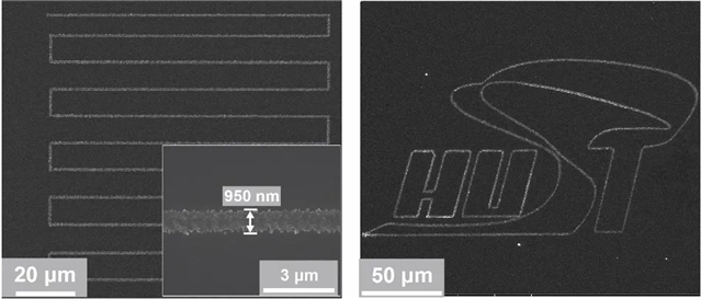 研究人员制备了一系列二维图案化氧化锌纳米材料产物,例如弓形线和HUST标志,如图3所示。