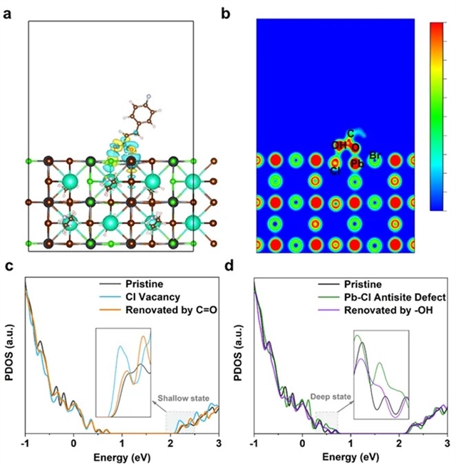 作者开展了一系列实验(图2)和DFT理论计算(图3)以研究isCl改善准二维钙钛矿薄膜光电性能的机理。在isCl处理过程中,释放的氯离子同时修复了准二维钙钛矿体内以及表面的卤离子空位,这有利于扩大钙钛矿的带隙,促进蓝移发射。同时,isCl处理过程中产生的p-FCA中的C=O基团与表面未配位的铅结合修复表面的浅能级缺陷,同时p-FCA中的-OH可与卤离子发生相互作用以抑制铅-卤反位缺陷的形成从而修复深能级缺陷。