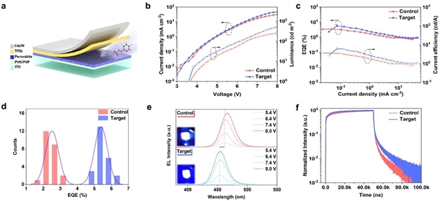 图1. 深蓝PeLED器件性能。