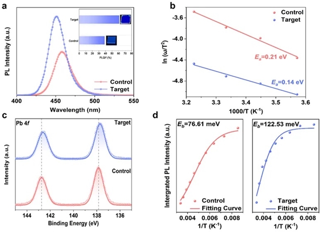 该工作提出了一种同时修复准二维钙钛矿薄膜的深能级与浅能级缺陷、重构量子阱结构的新方法,通过原位氯化后处理过程中与前体各组分之间的强相互作用显著改善了准二维钙钛矿薄膜的激子结合能以及载流子传输与转移效率,提高了深蓝光钙钛矿发光二极管的器件效率,推动了钙钛矿发光二极管全彩显示的应用发展。