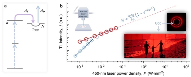 针对上述挑战,研究团队推出上转换充能 (UCC) 技术,通过非线性激发为陷阱充电 (图1a)。其原理类似于为电子搭建能量梯子:低能光子层层递进,最终将电子送入高能陷阱,让低能光子也能完成高能任务。