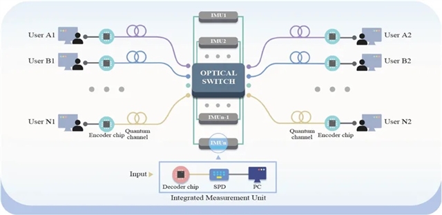 图1为合作团队提出的芯片嵌入的星型QDS网络架构。将复杂且难以集成的测量设备集中部署在网络中心节点。而每个用户只需持有一个小型化和低成本的发射器芯片即可在不同用户间执行数字签名任务。此外,这种网络架构能够集成到现有的通信基础设施中,并且通过灵活配置集成测量单元(IMU),使其能够适用测量设备无关类协议,从而提升网络性能。