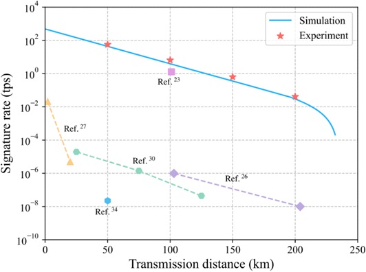 为了验证图1所示的芯片化QDS网络,研究团队构建了一个如图3所示的三节点芯片量子网络。这个网络包括一个中心节点,分配给签名者Alice,以及两个子节点,分配给接收者Bob和验证者Charlie。其中,Bob和Charlie各自持有一只硅基编码器芯片,Alice持有一只硅基解码器芯片。研究团队基于该网络配置,采用发展的新型QDS协议开展实验。为了展示该工作带来的突破,研究人员在图4中汇总了不同距离下开展QDS实验获得的结果。值得一提的是,所提的芯片化QDS方案在200 km的光纤距离下,签名1 Mbit文件实现了0.04次每秒的签名速率。