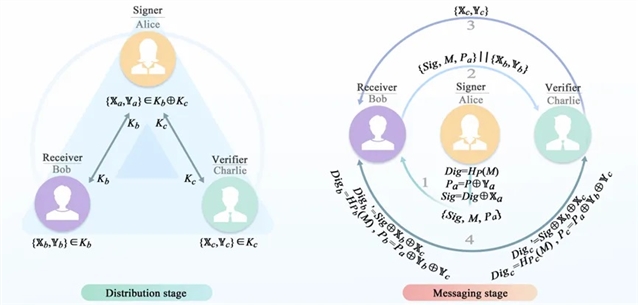 近日,广西大学、国家信息光电子创新中心、中国人民大学以及南京大学合作,利用硅光子集成技术和单诱骗态一次全域哈希QDS协议,成功克服了QDS在实际应用中面临的设备体积大、成本高以及系统签名率低的难题。研究团队提出并验证了一种芯片嵌入的高效率量子数字签名网络。在200 km的通信距离下,签名1 Mbit文件实现了0.04次每秒的签名速率。该成果以Chip-integrated quantum signature network over 200 km为题发表在国际光学顶尖期刊《Light: Science Applications》,博士生杜永强(广西大学)、李炳宏(南京大学)、曹啸宇(南京大学)以及国家信息光电子创新中心华昕博士为该论文共同第一作者,广西大学韦克金教授、国家信息光电子创新中心总经理肖希以及中国人民大学副教授尹华磊为共同通信作者。