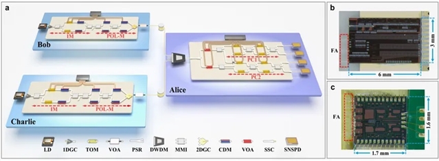 图3. 实验设置。(a) 基于芯片的三节点量子网络。(b) 硅基编码器芯片的显微图。(c) 硅基解码器芯片的显微图。
