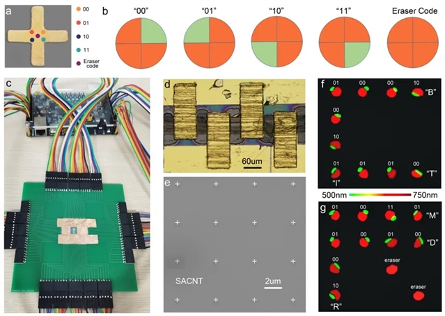 结合可编程门阵列技术的电子束调控技术,作者团队进一步实现了远场红绿二色辐射模式的编程调控,并应用于加密显示如图3所示。不同激发位点实现对00011011消除码等基于ACSII编码信息加密,通过读取光学傅里叶面的信息译密。实现了大写字母CR的非密显示,与BITMRD(Mixed Reality and Display首字母)的加密信息读取。