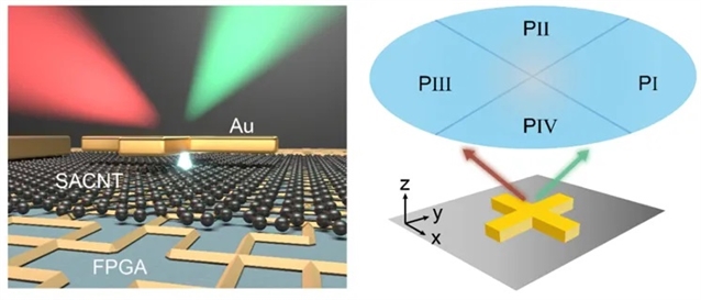 作者团队提出了通过电子束激发光路由效应在深亚波长尺度上对红绿二色光子动量的调制方法。当片上电子源的电子束激发单个金纳米天线的特定位置时,远场辐射的绿色和红色激发光被路由到不同的传播方向,如图1所示。通过改变电子束的激发位点,可以触发远场特征辐射模式转换,从而实现红绿二色光子辐射方向的选择性激发。