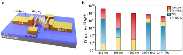 此外研究团队搭建了基于Ta2NiSe5和WS2的Type I异质结,在降低暗电流的同时提升了器件的栅极调控能力。异质结器件在可见及红外波长表现出明显的光伏效应,在太赫兹波段实现了EIW效应和结效应协同作用下的光电响应。如图3所示,异质结器件相较单质器件在可见及红外波长实现了2个数量级以上的室温D*提升,同时太赫兹波段性能也得到了进一步提升。