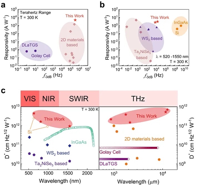 研究团队在图4中将研究成果与已报道的工作进行了对比。在太赫兹波段,本文的Ta2NiSe5基探测器的室温响应率、电子学带宽和D*均大幅优于商用器件和已报道的二维材料的太赫兹探测器。在可见光到红外波长,本文的Ta2NiSe5基探测器的室温响应率优于商用红外探测器和已报道的二维材料探测器,与此同时,其室温电子学带宽相较大多数已报道的二维材料探测器有着明显提升。探测器的室温D*与已报道的Ta2NiSe5及WS2基二维材料探测器相比实现了1-2个数量级的进步,并可以媲美商用探测器的室温性能。