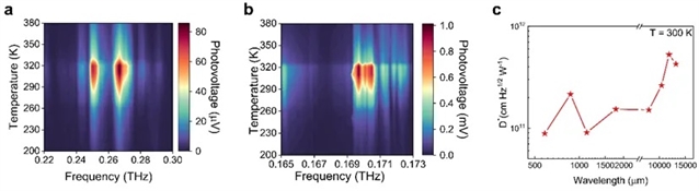 此研究团队对器件的变温光电响应特性展开研究,利用电磁诱导势阱(EIW)效应和EI相变下的输运性质突变,实现了与理论推导相吻合的太赫兹波段不寻常的室温光电响应极值(图2a和b)。通过对器件变温噪声和变温响应时间的进一步研究,确定了室温为器件的最佳工作区间。如图2c所示,探测器在500-15000 μm宽谱太赫兹波段的比探测率相较商用室温太赫兹探测器Golay Cell的7.0×109 cm Hz0.5 W-1的特征D*值提升了2个数量级。研究结果证明了Ta2NiSe5是极具潜力的室温高灵敏探测候选材料。