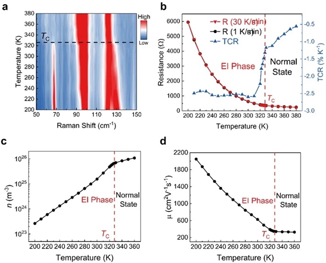 研究团队通过变温拉曼光谱表征了EI相变下Ta2NiSe5的晶格畸变(图1a),并通过变温电学研究得到了Ta2NiSe5在相变温度326 K后电阻温度系数α值从-1.3 %至-2.5 %的突变(图1b)。变温霍尔表征进一步展现了Ta2NiSe5由于激子凝聚作用在相变后的载流子浓度快速下降和迁移率的快速上升(图1c和d),揭示了电子-声子耦合作用引起输运性质剧变带来电学性质突变的物理本质。