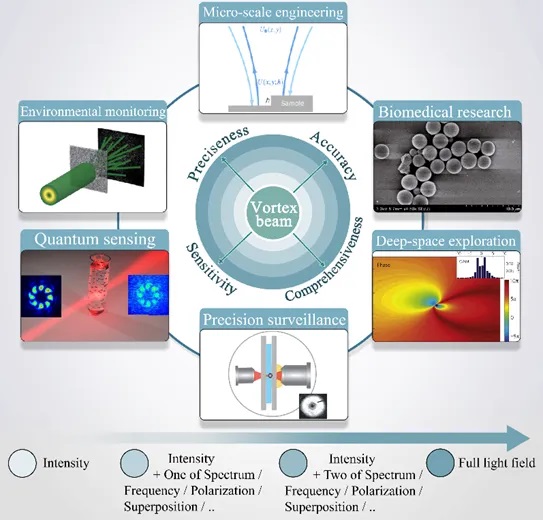 相比于传统光束,涡旋光束具备更高维度的信息传递能力,能够通过线性与旋转多普勒效应,精确测量物体的三维运动,包括转动和平移速度。更令人兴奋的是,涡旋光束的OAM谱可以作为独特的特征数据进行整合,使得计量分析能力跨越式提升。这一技术已在微尺度工程、生物医学、深空探索、量子传感等领域展现出广阔的应用前景。