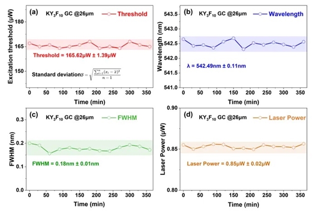 使用980nm连续波激光器激发纳米晶复合玻璃微球,实现超低阈值连续上转换激光输出(图2)。较ZBLAN玻璃微球,泵浦阈值降低45%,斜率效率提升4倍;较聚合物涂层方案,长期稳定性提升超10倍。最终实现下列RGB激光参数:1)蓝光(480 nm):阈值47 μW,斜率效率0.28%;2)绿光(550 nm):阈值53 μW,斜率效率0.31%;3)红光(660 nm):阈值62 μW,斜率效率0.25%。