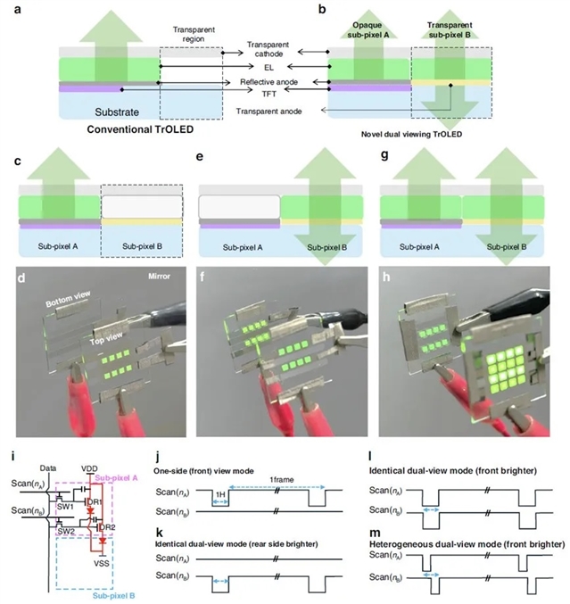突破性的不仅在于阴极材料的创新,更在于整个器件结构的颠覆性设计。研究团队针对传统透明OLED在正反两侧显示不平衡的问题,提出了一种独特的像素设计方案。每个像素由两个独立的子像素构成:子像素A采用反射式结构,仅向正面发光;子像素B则采用全透明结构,可实现正反双向同时发光。