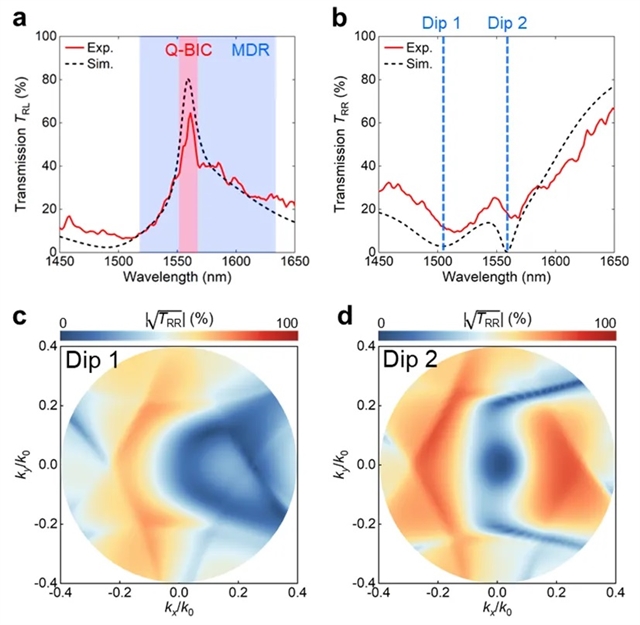 通过在参数空间中打破面内对称性,集成共振单元激发了非局域谐振,即连续域中的准束缚态(q-BIC),提供了高品质因子。同时,引入局域模式米氏磁偶极子谐振(MDR),二者互为垂直偶极子,产生弱耦合下的法诺效应,进而实现了高透射偏振转换效率TRL和低未转换效率TRR。出射的左旋光具有稳定的相位调制,而右旋光几乎没有相位变化。此外,非局域效应引入了对入射角度的色散响应(见图2)。因此,左旋光部分可视为一个高品质因子、高效率的超构透镜,而右旋光部分则充当空间频率滤波器,可分别用于明场成像和边缘检测。
