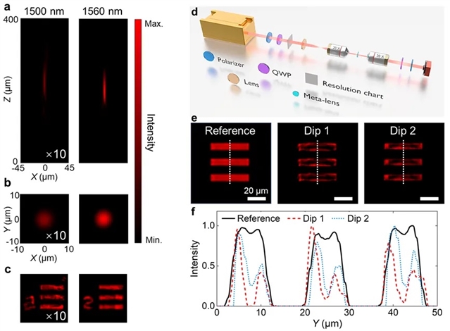 实验结果表明,所设计的非局域惠更斯超构透镜在共振波长下,波长选择性聚焦和明场成像的效率相比非共振波长提高了至少十倍。与此前的研究相比,通过优化非局域效应,显著提升了成像质量。另一种输出自旋状态用于边缘增强成像,能够清晰解析微米级物体(见图3)。