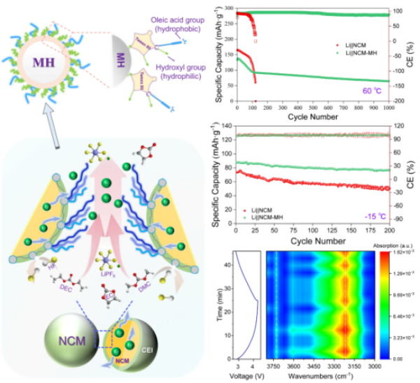 研究团队以吐温80(Tween80)为框架物质构建了一种弱交联柔性受限空间,采用电沉积获得了所需超细纳米氢氧化镁载体(D50=15 nm),并通过Tween80原位改性实现纳米氢氧化镁功能化。研究人员用所得材料对锂电池三元正极材料(LiNi0.5Co0.2Mn0.3O2)进行表面修饰,并进行电池组装和性能测试。原位红外分析表明,Li⁺与 Tween80 分子间存在持续的配位和解离过程,使Tween80分子荷电状态发生动态变化,并在电场作用下发生连续的构型转变,即“烷基链摇曳”行为。烷基链摇曳使得纳米氢氧化镁在电池循环伊始就参与反应,快速形成薄而致密的富镁无机正极固态电解质界面膜。这种膜热稳定性高、耐腐蚀性强,能够有效抵御高温电解液攻击。在低温环境下,电解液通常会在正极表面积聚,并常因流动性差而阻碍锂离子传输。此时烷基链摇曳可显著促进电解液的界面流动,兼之富镁界面层具有优异离子导电性,使锂离子低温传输变得顺畅。