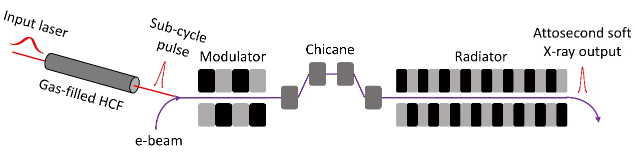 针对上述问题,中国科学院上海高等研究院研究员冯超团队联合上海光学精密机械研究所副研究员黄志远团队,提出利用气压梯度空芯光纤良好的宽谱传输能力与可调控的色散/非线性特性,将多周期中红外激光压缩至亚周期尺度,并利用该亚周期激光调制电子束来获得孤立的电流尖峰,且在波荡器中实现高信噪比孤立阿秒FEL脉冲的产生。同时,该亚周期激光与阿秒FEL自然同步,为阿秒泵浦-探测提供理想的工具。