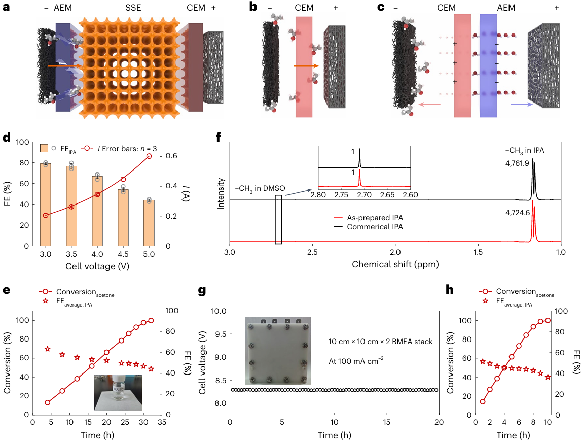 随后,针对电解产物与电解质溶液分离的问题,研究者采用反向工作模式的双极膜膜电极设计,在避免电解质溶液使用的同时,其内界电场大幅抑制了原料和产物的跨膜损失,结合I-Ru催化剂,实现了纯丙酮到高纯IPA(~100%)的完全转化,并完成了10 cm × 10 cm × 2规模的反应堆栈验证,成功获得了可用于生物发酵的高浓度、高纯度电子载体。
