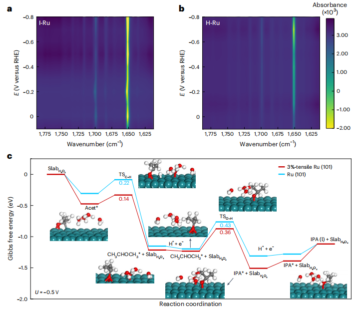 图3:I-Ru催化剂在丙酮电化学还原中的机理研究。