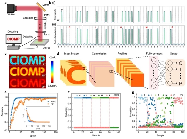 作为演示,图4a-b中展示了该系统在偏振调制光通信中的应用,实现了信号的完美再现。此外,器件作为单像素成像设备,有力地展示了该器件在线偏振光电探测领域的潜力,并通过人工神经网络实现了超过99%的图像识别精度(如图4c-g)。这些结果表明了该系统在安全光通信、高光谱成像和人工视觉等领域的巨大应用潜力。