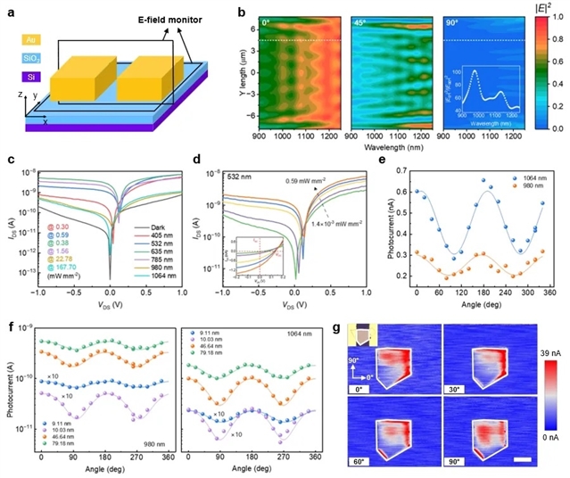 为突破这些限制,研究团队设计并构建一个基于全二维材料的偏振探测系统,引入并提升各向同性二维材料的偏振敏感特性。通过将基于WSe2的光电探测器与基于MoS2的场效应晶体管集成,来实现高性能的宽带偏振探测(如图1c)。研究团队利用金属电极诱导的热电子注入,在电极边缘产生了具有偏振依赖性的局域电场。如图2a-b所示,在红外波段,局域电场表现出明显的偏振依赖性:当入射光的偏振方向垂直于电极边缘时最强;而当偏振方向平行于电极边缘时最小。鉴于此,团队设计了一个金属-半导体肖特基界面作为热电子的捕获受体,以偏振非敏感的WSe2作为沟道材料制备了肖特基光电探测器,从而排除了沟道材料本身对偏振吸收的影响。图2c展示了器件在近红外波段表现出显著的偏振依赖的光响应。器件的各向异性光电流比在1064 nm和980 nm波长下分别达到约2和1.5。该设计打破了片上偏振探测器对低对称结构材料的长期依赖,但值得注意的是,相对于局域电场的差异而言,在器件中仅获得了一个较低的各向异性比,难以满足实际应用。
