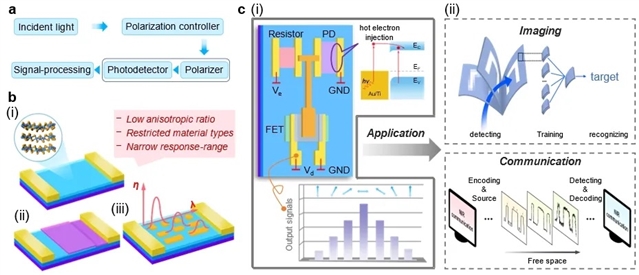 偏振作为光的重要属性,能够为光信号提供额外的信息维度,从而增强成像对比度和信息传递效率。因此,偏振敏感技术在光通信、光谱学、远程偏振成像和人工视觉等领域发挥着至关重要的作用。然而,传统的偏振光检测系统依赖于偏振光元件和传统光电探测器的组合(如图1a),这种组合方式不仅体积庞大,而且制造过程复杂,成本高昂,难以满足现代微型化、高性能光电系统的需求。