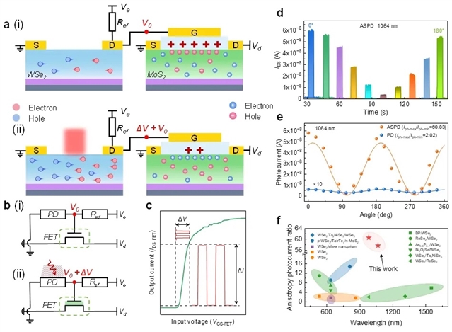 因此,为了进一步提升器件性能,研究人员构建了一个片上集成的放大系统,将基于MoS2的场效应晶体管与WSe2偏振光电探测器集成。其中WSe2肖特基探测器作为感光单元,MoS2晶体管作为放大单元和输出端口,随着输入光状态的变化(开/关状态、不同偏振状态),导致晶体管栅极电压发生变化,从而使得晶体管在开/关状态之间切换,输出电流呈现数量级的变化(如图3a-c)。该系统在1064 nm的光照下,将WSe2肖特基探测器的各向异性光电流比提升至超过60,远高于同体系材料的偏振光电探测器(如图3d-f)。并且系统也表现出较高的光敏度,在红外和可见波段的光开/关比分别为4.4×103和5.7×105。