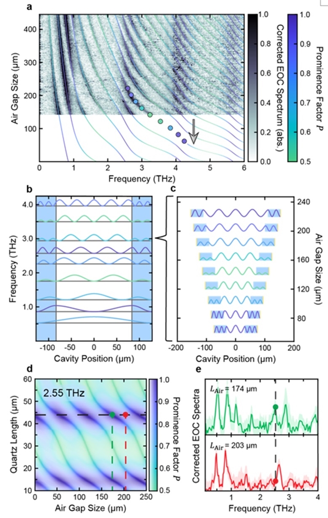 研究人员开发了一种可调谐的多层腔设计,这种设计能够在单一设备中实现腔模式频率的连续调节。这种混合EOC设计不仅扩展了EOCs的功能,还为探索光与物质相互作用提供了新的实验平台。如图2展示了混合EOC的设计和代表性信号。