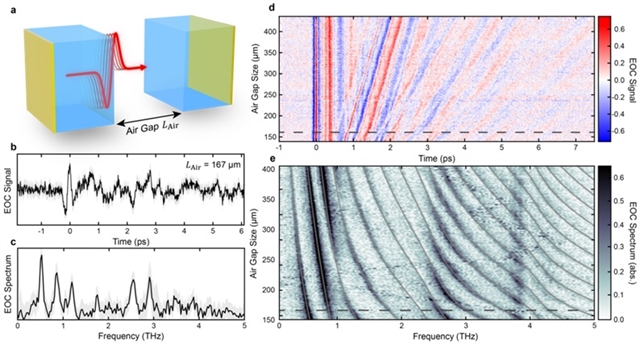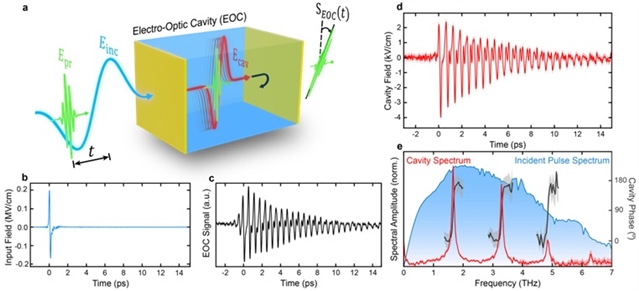 该研究所提出的光电腔利用光电效应实现了对太赫兹波段腔内电场的直接和定量测量。这种有源腔设计突破了以往无法直接访问腔内场的限制,允许在亚周期时间尺度上对电场进行测量,极大地提高了对太赫兹波段光与物质相互作用的理解。如图1展示了光电腔的工作原理和实验装置。