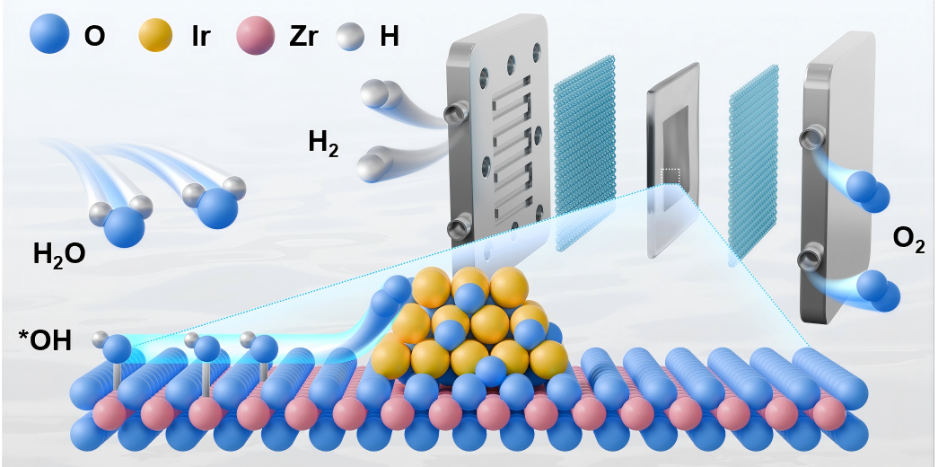 研究团队开发的多孔四方氧化锆上负载氧化铱团簇(IrOx/t-ZrO2),在三电极体系下表现出高质量活性。研究团队进一步揭示了在IrOx团簇上的活性晶格氧机制(LOM),且发现四方相t-ZrO2负载的IrOx/t-ZrO2样品遵循LOM反应机制,而这种路径使得样品有高的OER反应活性,提高样品工况稳定性。