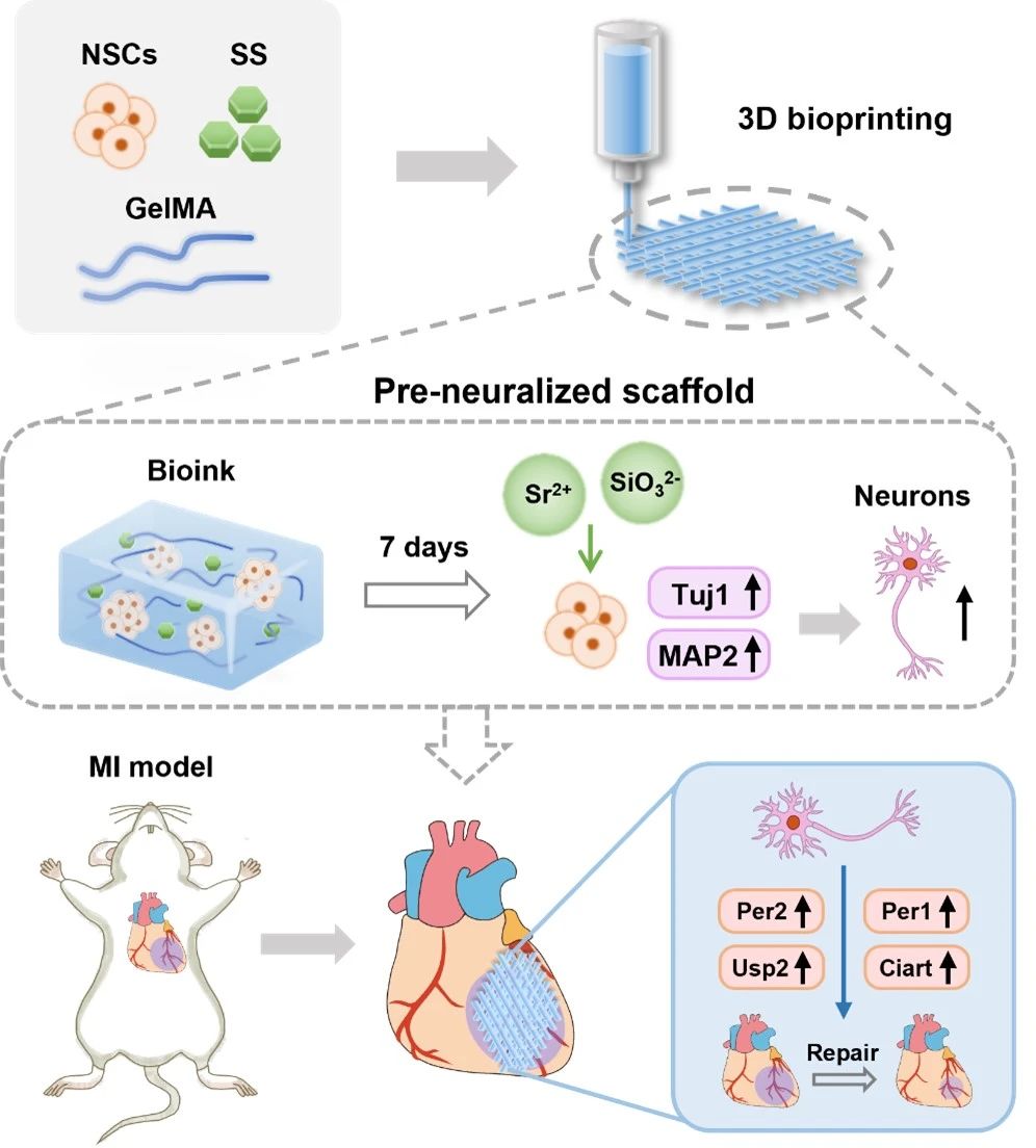 研究团队利用无机生物材料硅酸锶对神经干细胞进行诱导,以生物相容性水凝胶GelMA为基体,设计了一种生物3D打印预神经化心肌修复支架。