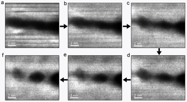 同时,研究人员根据对自修复的理解,率先提出利用电子束辐照进一步增强断面自修复效率的策略并加以验证,同时通过原子尺度原位辐照技术揭示了Ti3AlC2 MAX相辐照效应及其对断面自修复的影响机制。相关研究成果以Enhancing the Self-Healing Efficiency of Ti3AlC2 MAX Phase via Irradiation为题,发表在《纳米快报》(Nano Letters)上。