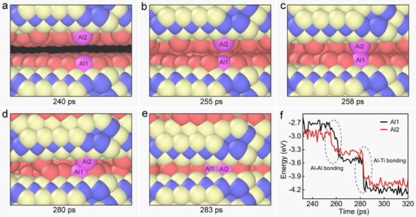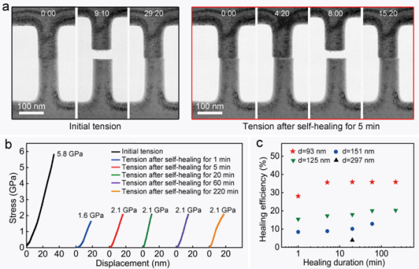 近期,中国科学院宁波材料技术与工程研究所报告了在室温下Ti3AlC2 MAX相纳米线固有且高效的自修复现象。透射电镜原位定量拉伸实验表明,Ti3AlC2纳米线断面自修复5分钟后,其断裂强度能够恢复至2.1 GPa,自修复效率可达36.2%,且直径越小,自修复效率越高。研究通过原子尺度表征结合第一性原理计算和分子动力学模拟揭示了其微观物理机制。相关研究成果以Highly Efficient Self-Healing of Fractured Ti3AlC2 MAX Phase Nanowires为题,发表在《先进功能材料》(Advanced Functional Materials)上。