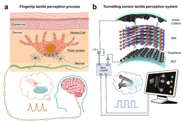 近日,中国科学院重庆绿色智能技术研究院研究团队受人体指尖默克尔细胞启发,提出一种共形石墨烯纳米墙-六方氮化硼-石墨烯(CGNWs-hBN-Gr)准二维垂直隧穿触觉传感器,利用hBN隧穿通道模拟PZ蛋白的生物机械门控离子通道,通过微纳米多尺度力敏界面实现了原子层间隧穿电流的宏观调控。