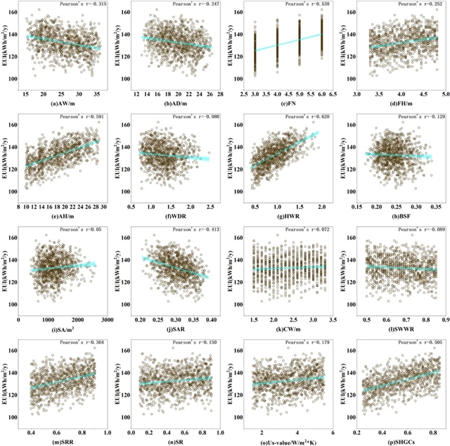 ▲ 图四:形态参数与能源性能的散点图,(a) 外墙面积(AW),(b) 窗户面积(AD),(c) 楼层数量(FN),(d) 建筑高度(FH),(e) 建筑总面积(AH),(f) 窗墙比(WDR),(g) 高宽比(HWR),(h) 建筑体形系数(BSF),(i) 屋顶面积(SA),(j) 屋顶面积比(SAR),(k) 窗墙面积(CW),(l) 南向窗墙比(SWWR),(m) 太阳能得热率(SRR),(n) 太阳能反射率(SR),(o) 外墙传热系数(Us),(p) 窗户太阳得热系数(SHGCs)。©本文作者