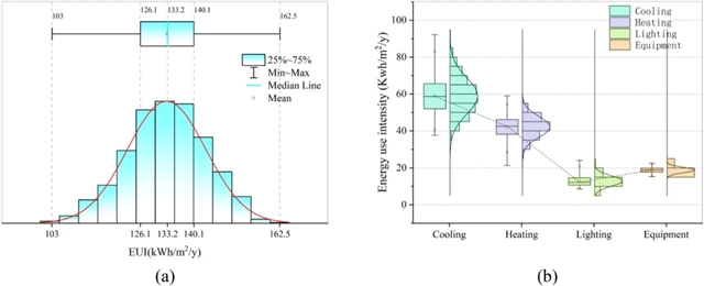 ▲ 图三:建筑能耗强度(EUI)总体分布特征。(a) 样本案例中建筑能耗强度(EUI)的分布情况;(b) 样本案例中按项目分类的建筑能耗强度(EUI)分布情况。©本文作者